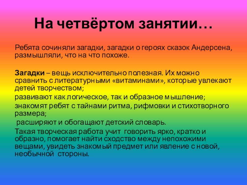 Загадки – вещь исключительно полезная. Их можно сравнить с литературными «витаминами», которые увлекают детей творчеством;