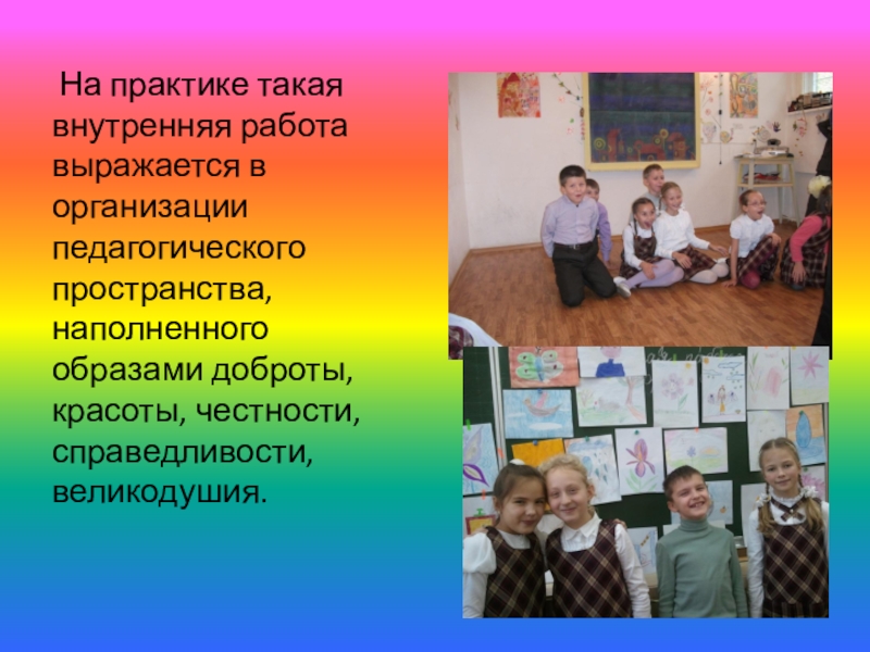 Слайд 6 На практике такая внутренняя работа выражается в организации педагогического пространства,