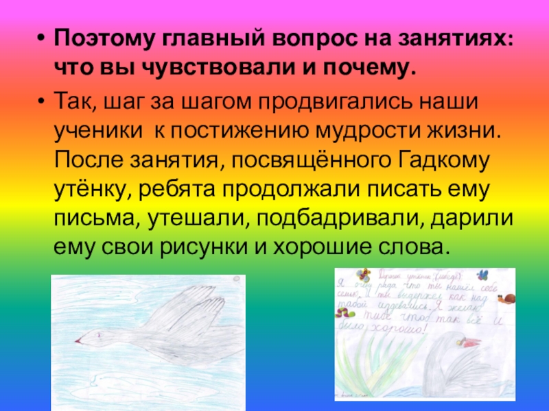 шаг за шагом продвигались наши ученики к постижению мудрости жизни. После занятия, посвящённого Гадкому утёнку, ребята продолжали писать ему письма, утешали, подбадривали, дарили ему свои рисунки и хорошие слова.