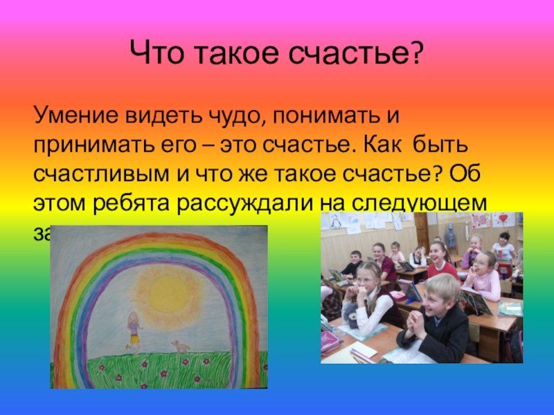 счастье. Как быть счастливым и что же такое счастье? Об этом ребята рассуждали на следующем занятии.
