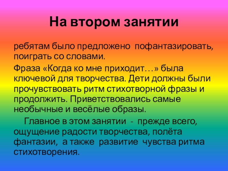 Главное в этом занятии - прежде всего, ощущение радости творчества, полёта фантазии, а также развитие чувства ритма стихотворения.