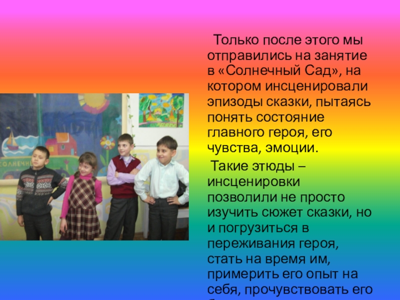 Такие этюды – инсценировки позволили не просто изучить сюжет сказки, но и погрузиться в переживания героя, стать на время им, примерить его опыт на себя, прочувствовать его боль и страдания.