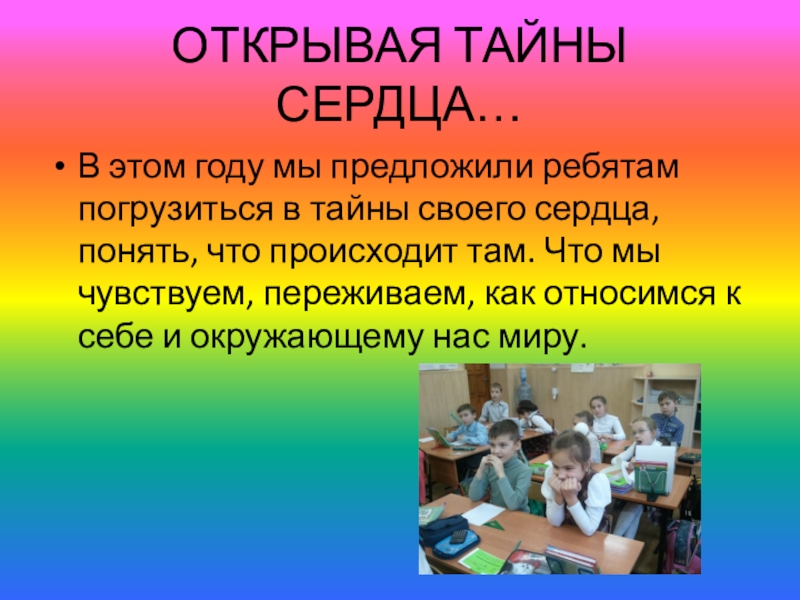 направленных на размышление, постижение нравственных ценностей, умение слушать своё сердце и сердца своих товарищей, способность выражать свои мысли в литературной