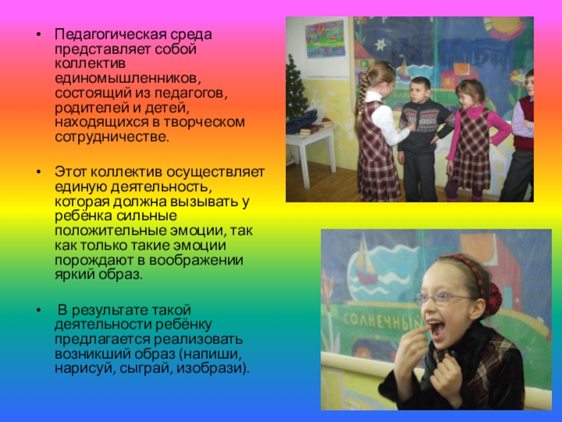 Этот коллектив осуществляет единую деятельность, которая должна вызывать у ребёнка сильные положительные эмоции, так как только такие эмоции порождают в воображении яркий образ.