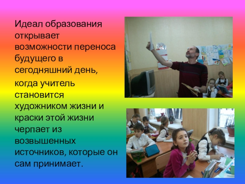 Слайд 3Идеал образования открывает возможности переноса будущего в сегодняшний день,