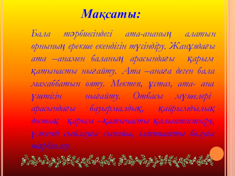 Слайд 3Бала тәрбиесіндегі ата-ананың алатын орнының ерекше екендігін түсіндіру. Жанұядағы ата –анамен