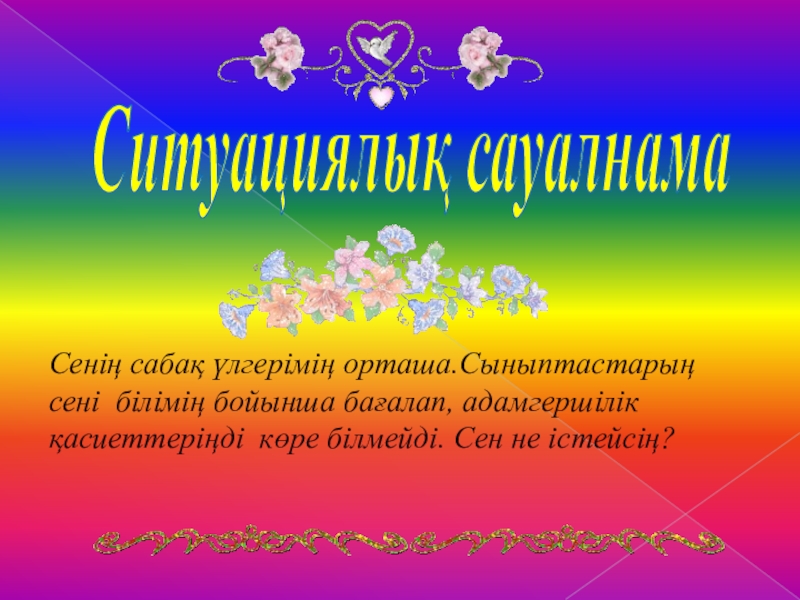 Ситуациялық сауалнамаСенің сабақ үлгерімің орташа.Сыныптастарың сені білімің бойынша бағалап, адамгершілік қасиеттеріңді көре білмейді. Сен не істейсің?