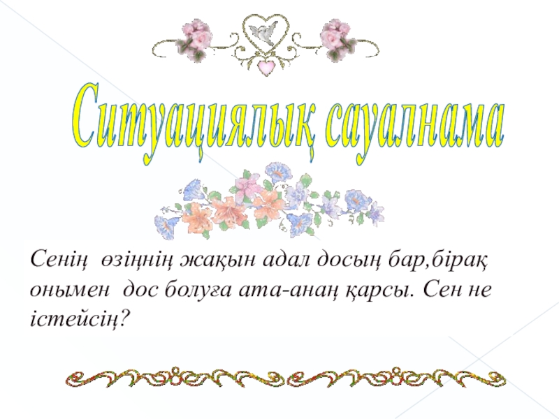 Ситуациялық сауалнамаСенің өзіңнің жақын адал досың бар,бірақ онымен дос болуға ата-анаң қарсы. Сен не істейсің?