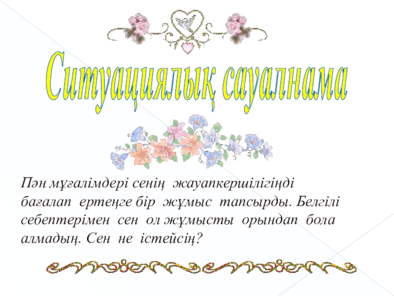 Ситуациялық сауалнамаПән мұғалімдері сенің жауапкершілігіңді бағалап ертеңге бір жұмыс тапсырды. Белгілі себептерімен сен ол жұмысты орындап бола