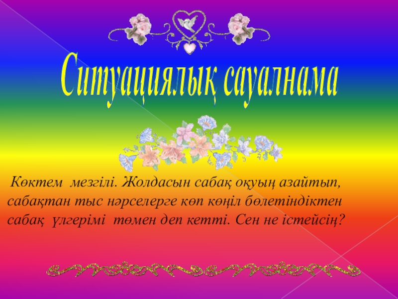Ситуациялық сауалнама Көктем мезгілі. Жолдасын сабақ оқуың азайтып,сабақтан тыс нәрселерге көп көңіл бөлетіндіктен сабақ үлгерімі төмен деп