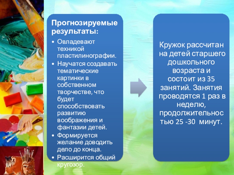 Каждое занятие содержит не только практические задачи, но и воспитательно- образовательные, что в целом позволяет всесторонне развивать личность ребёнка. Дети получают знания и умения, навыки, идёт осознание единства человека с природой, знакомство с миром разных предметов в процессе частичного использования так называемого бросового материала, расширяются возможности изобразительной деятельности детей.
