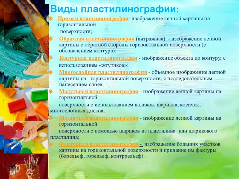 Фактурная пластилинография - изображение больших участков картины на горизонтальной поверхности и придание им фактуры (барельеф, горельеф, контррельеф).