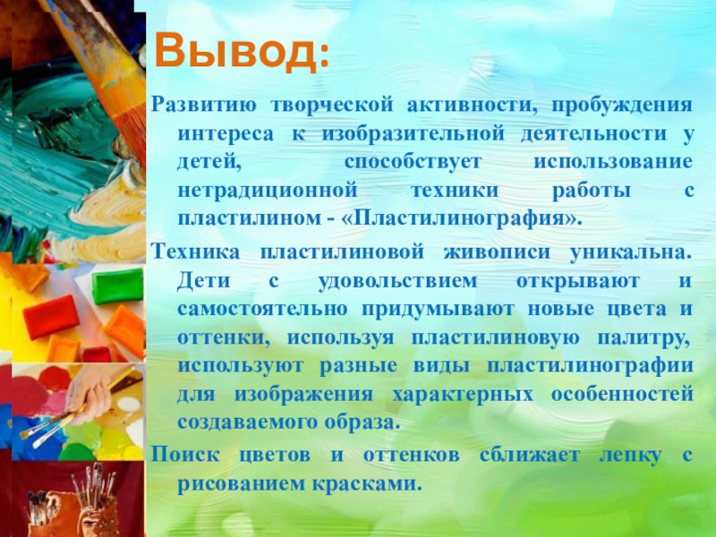 Техника пластилиновой живописи уникальна. Дети с удовольствием открывают и самостоятельно придумывают новые цвета и оттенки, используя пластилиновую палитру, используют разные виды пластилинографии для изображения характерных особенностей создаваемого образа.
