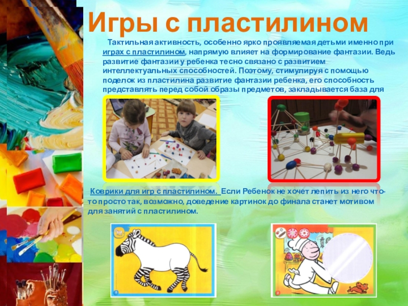 ярко проявляемая детьми именно при играх с пластилином, напрямую влияет на формирование фантазии. Ведь развитие фантазии у ребенка тесно связано с развитием интеллектуальных способностей. Поэтому, стимулируя с помощью поделок из пластилина развитие фантазии ребенка, его способность представлять перед собой образы предметов, закладывается база для развития интеллекта ребенка.