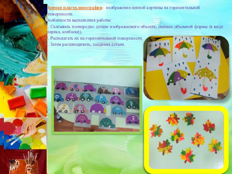 Слайд 8Прямая пластилинография- изображение лепной картины на горизонтальной
