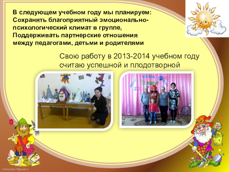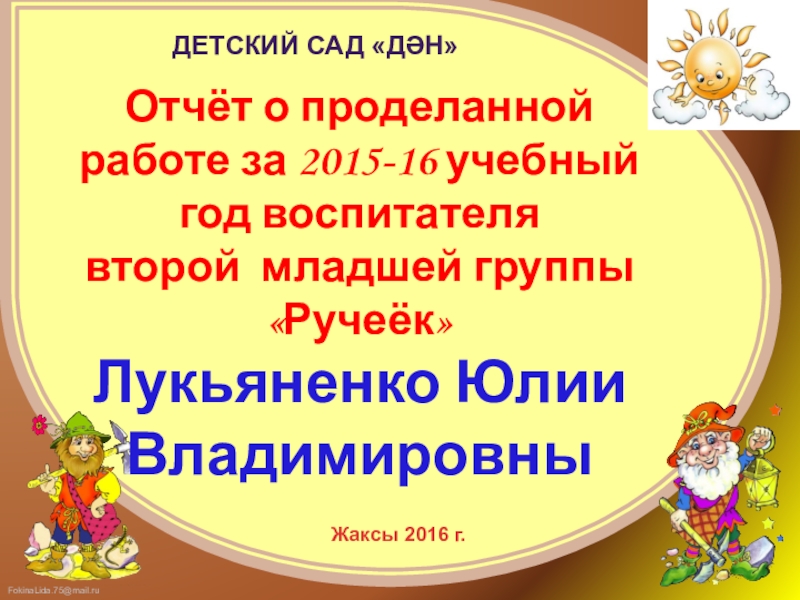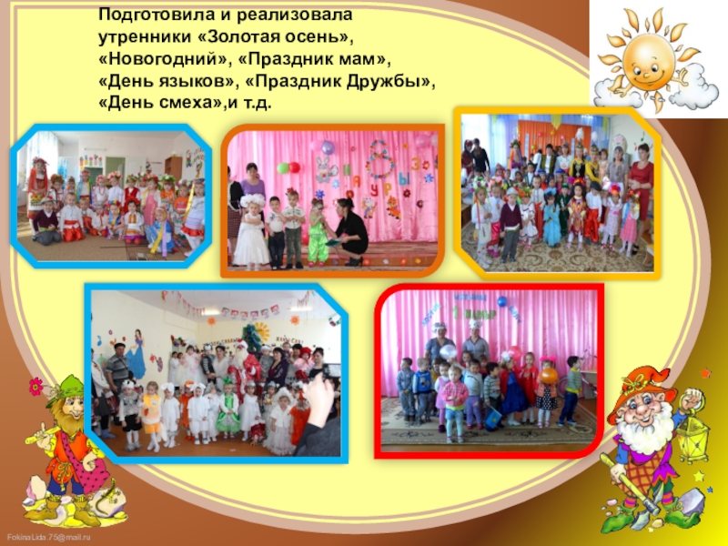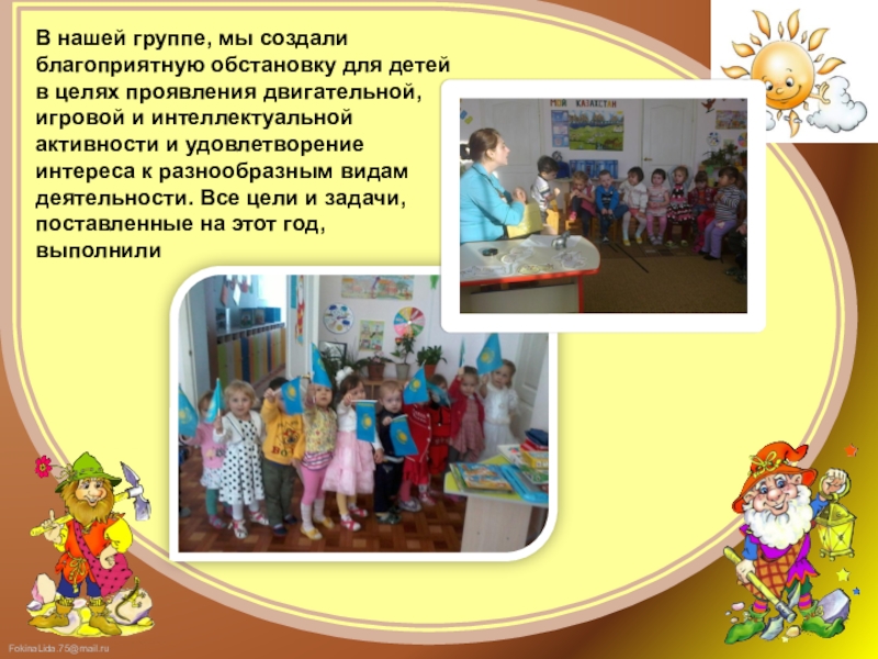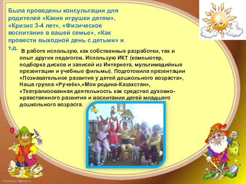 В работе использую, как собственные разработки, так и опыт других педагогов. Использую ИКТ (компьютер, подборка дисков и записей из Интернета, мультимедийные презентации и учебные фильмы). Подготовила презентации «Познавательное развитие у детей дошкольного возраста», Наша группа «Ручеёк»,«Моя родина-Казахстан», «Театрализованная деятельность как средство духовно-нравственного развития и воспитания детей младшего дошкольного возраста.