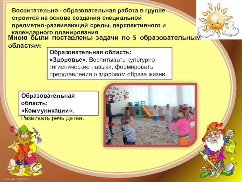 Образовательная область: «Здоровье». Воспитывать культурно-гигиенические навыки, формировать представления о здоровом образе жизни.