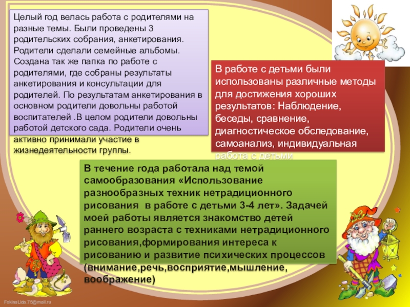 В течение года работала над темой самообразования «Использование разнообразных техник нетрадиционного рисования в работе с детьми 3-4 лет». Задачей моей работы является знакомство детей раннего возраста с техниками нетрадиционного рисования,формирования интереса к рисованию и развитие психических процессов (внимание,речь,восприятие,мышление,воображение)