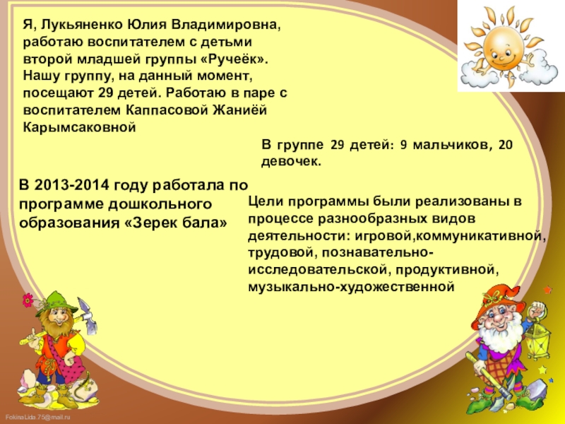 В 2013-2014 году работала по программе дошкольного образования «Зерек бала»