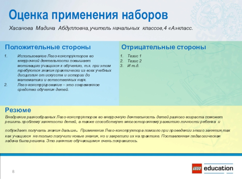 Внедрение разнообразных Лего-конструкторов во внеурочную деятельность детей разного возраста поможет решить проблему занятости детей, а также способствует многостороннему развитию личности ребенка и побуждает получать знания дальше. Применение Лего-конструктора помогло при проведении этого занятия,так как учащиеся не только получили новые знания, но и закрепили их на практике. Поставленная педагогическая задача была решена. Это занятие обучающимся очень понравилось.
