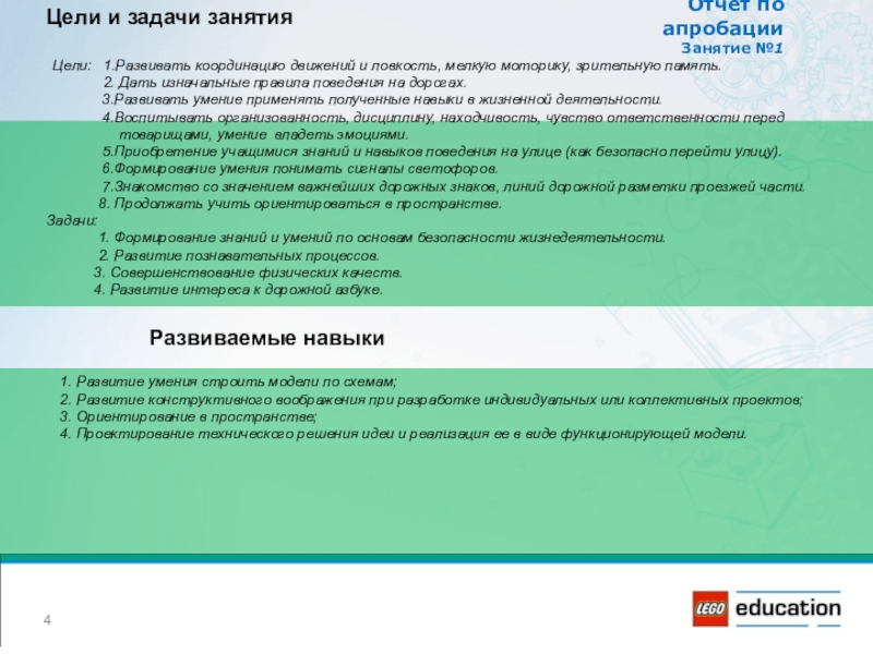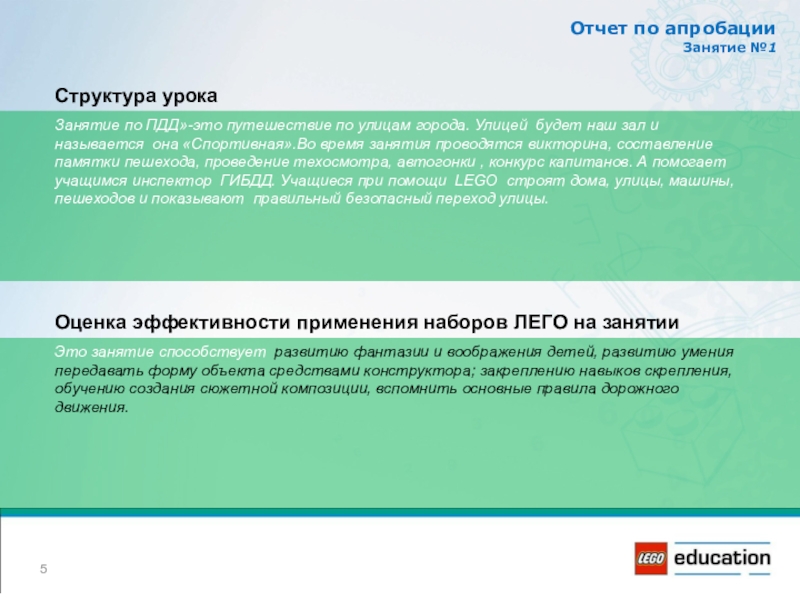Занятие по ПДД»-это путешествие по улицам города. Улицей будет наш зал и называется она «Спортивная».Во время занятия проводятся викторина, составление памятки пешехода, проведение техосмотра, автогонки , конкурс капитанов. А помогает учащимся инспектор ГИБДД. Учащиеся при помощи LEGO cтроят дома, улицы, машины, пешеходов и показывают правильный безопасный переход улицы.