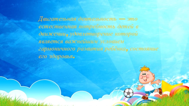 Слайд 2Двигательная деятельность — это естественная потребность детей в движении, удовлетворение которой
