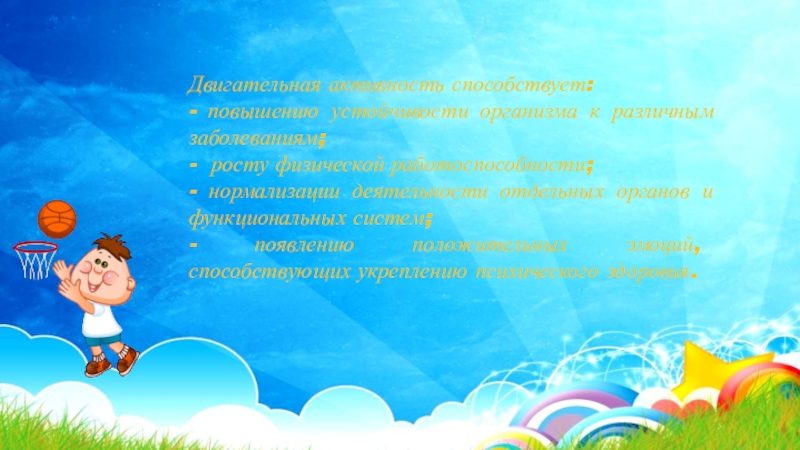 Двигательная активность способствует:- повышению устойчивости организма к различным заболеваниям;-  росту физической работоспособности;- нормализации деятельности отдельных органов и