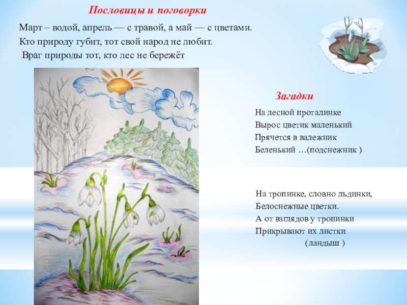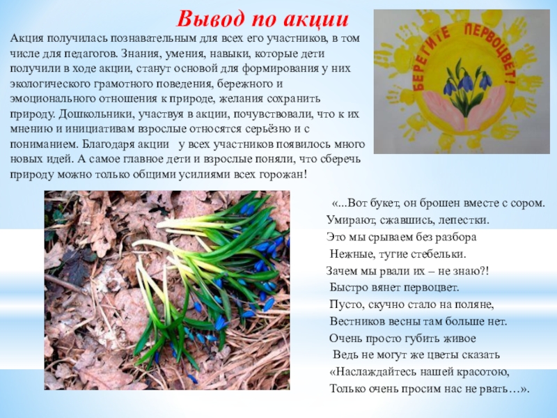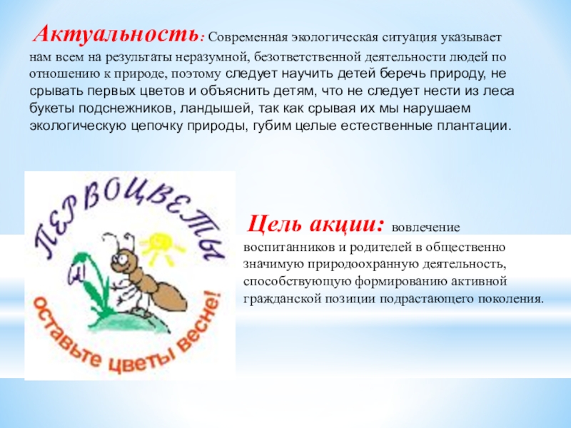 Актуальность: Современная экологическая ситуация указывает нам всем на результаты неразумной, безответственной деятельности людей по отношению к природе, поэтому следует научить детей беречь природу, не срывать первых цветов и объяснить детям, что не следует нести из леса букеты подснежников, ландышей, так как срывая их мы нарушаем экологическую цепочку природы, губим целые естественные плантации.