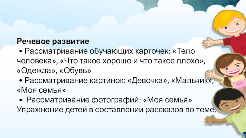 • Рассматривание картинок: «Девочка», «Мальчик», «Моя семья»