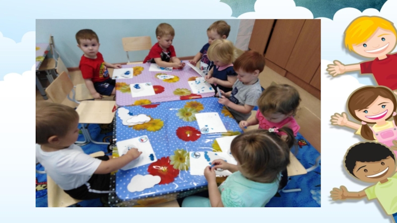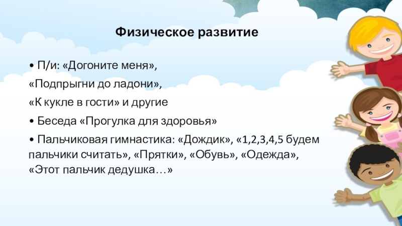 • Пальчиковая гимнастика: «Дождик», «1,2,3,4,5 будем пальчики считать», «Прятки», «Обувь», «Одежда», «Этот пальчик дедушка…»