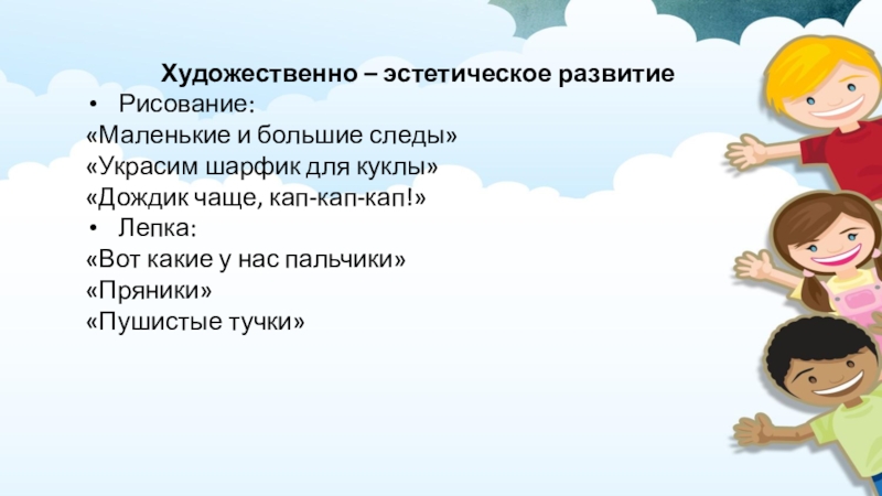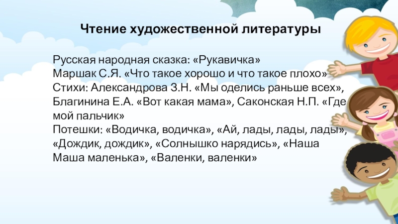«Дождик, дождик», «Солнышко нарядись», «Наша Маша маленька», «Валенки, валенки»