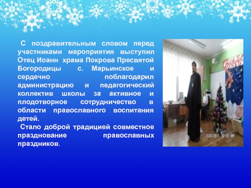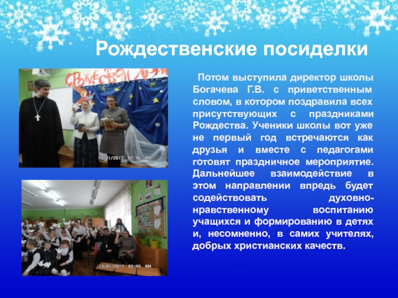 Богачева Г.В. с приветственным словом, в котором поздравила всех присутствующих с праздниками Рождества. Ученики школы вот уже не первый год встречаются как друзья и вместе с педагогами готовят праздничное мероприятие. Дальнейшее взаимодействие в этом направлении впредь будет содействовать духовно-нравственному воспитанию учащихся и формированию в детях и, несомненно, в самих учителях, добрых христианских качеств.
