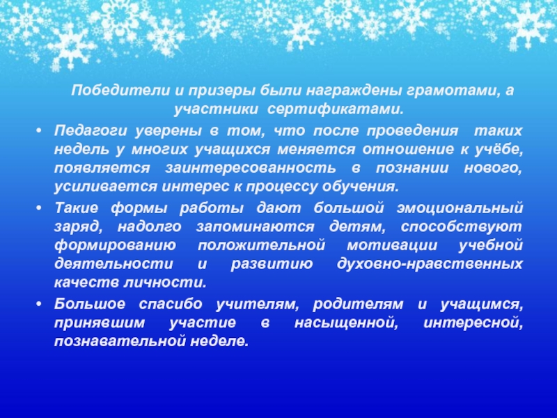 Большое спасибо учителям, родителям и учащимся, принявшим участие в насыщенной, интересной, познавательной неделе.