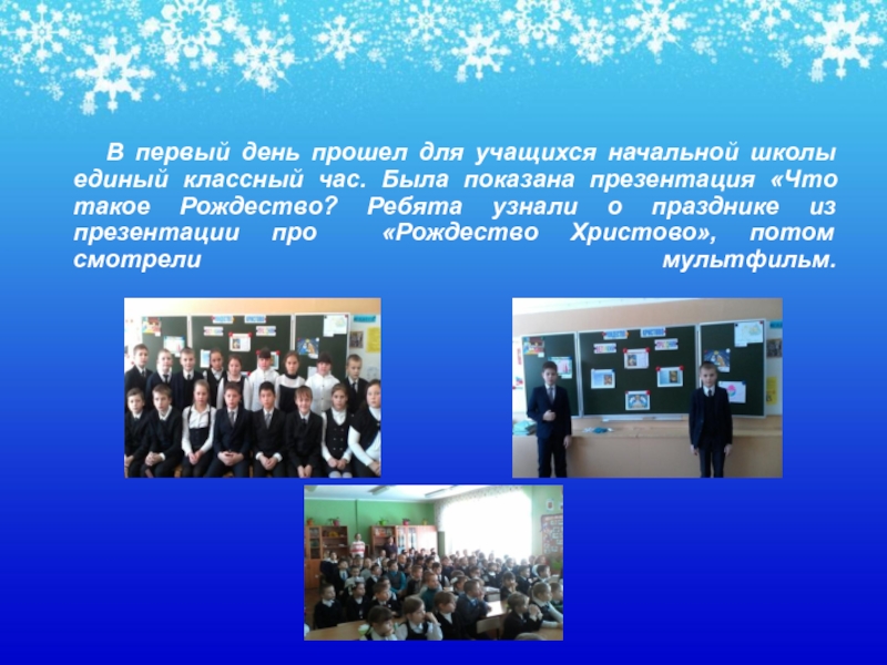 единый классный час. Была показана презентация «Что такое Рождество? Ребята узнали о празднике из презентации про «Рождество Христово», потом смотрели мультфильм.
