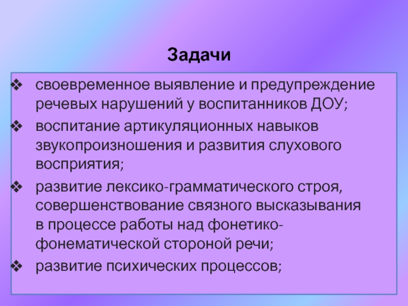 своевременное выявление и предупреждение речевых нарушений у воспитанников ДОУ;