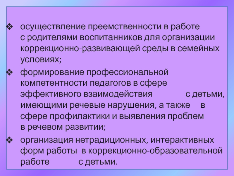 формирование профессиональной компетентности педагогов в сфере эффективного взаимодействия с детьми, имеющими речевые нарушения, а также в сфере профилактики и выявления проблем в речевом развитии;