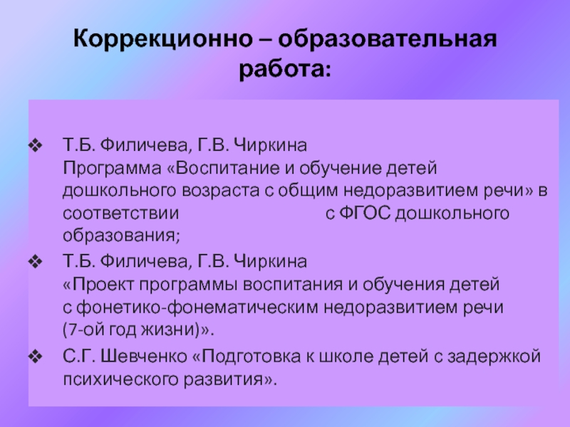 Т.Б. Филичева, Г.В. Чиркина «Проект программы воспитания и обучения детей с фонетико-фонематическим недоразвитием речи (7-ой год жизни)».