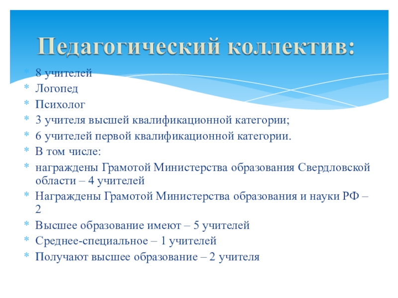 8 учителейЛогопедПсихолог3 учителя высшей квалификационной категории; 6 учителей первой квалификационной категории. В том числе:награждены Грамотой Министерства образования Свердловской области – 4 учителейНаграждены Грамотой Министерства образования и науки РФ – 2Высшее образование имеют – 5 учителейСреднее-специальное –