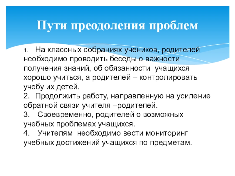 Пути преодоления проблем1.	На классных собраниях учеников, родителей необходимо проводить беседы о важности получения знаний, об обязанности учащихся
