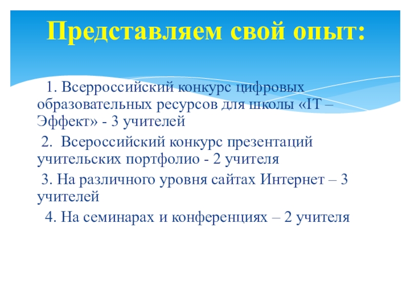 Представляем свой опыт:	1. Всерроссийский конкурс цифровых образовательных ресурсов для школы «IT –Эффект» - 3 учителей  2.