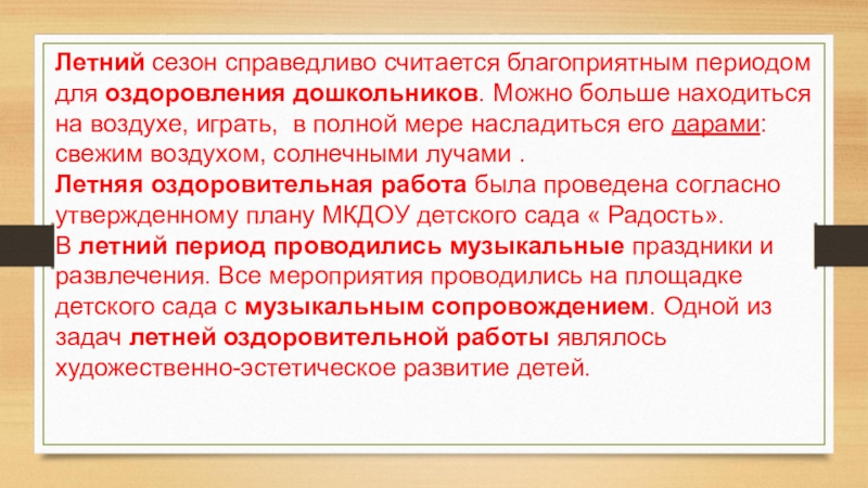Слайд 3Летний сезон справедливо считается благоприятным периодом для оздоровления дошкольников. Можно больше находиться на