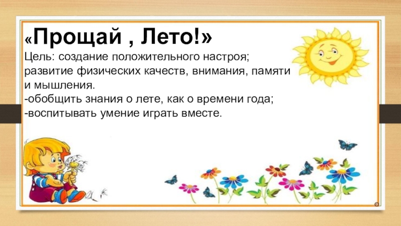 «Прощай , Лето!»Цель: создание положительного настроя; развитие физических качеств, внимания, памяти и мышления.-обобщить знания о лете, как