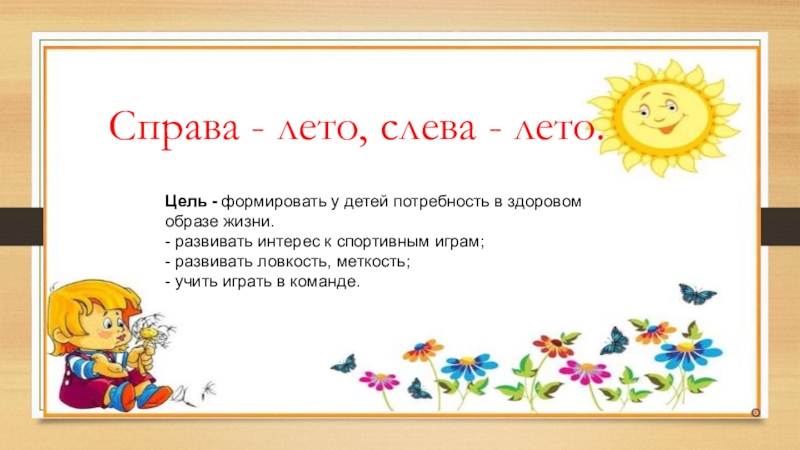 Справа - лето, слева - лето.Цель - формировать у детей потребность в здоровом образе жизни.- развивать интерес к