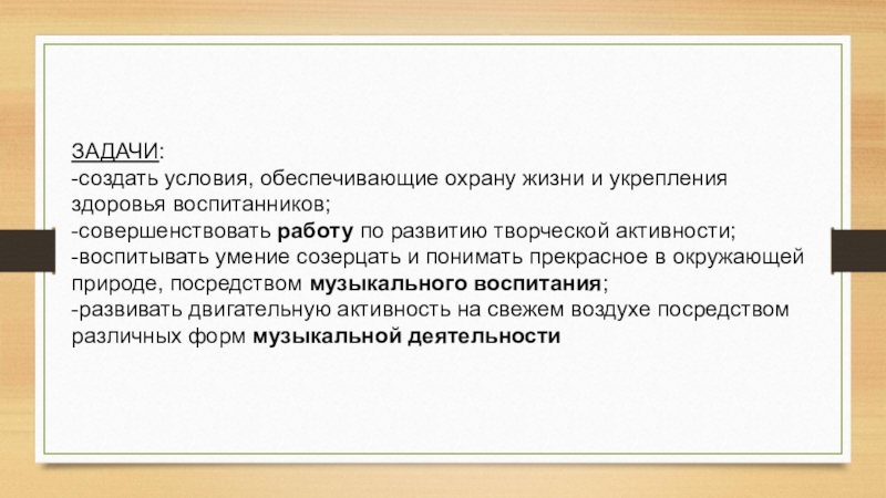 ЗАДАЧИ:-создать условия, обеспечивающие охрану жизни и укрепления здоровья воспитанников;-совершенствовать работу по развитию творческой активности;-воспитывать умение созерцать и понимать прекрасное в окружающей природе, посредством музыкального воспитания;-развивать двигательную активность на свежем воздухе посредством различных форм музыкальной деятельности