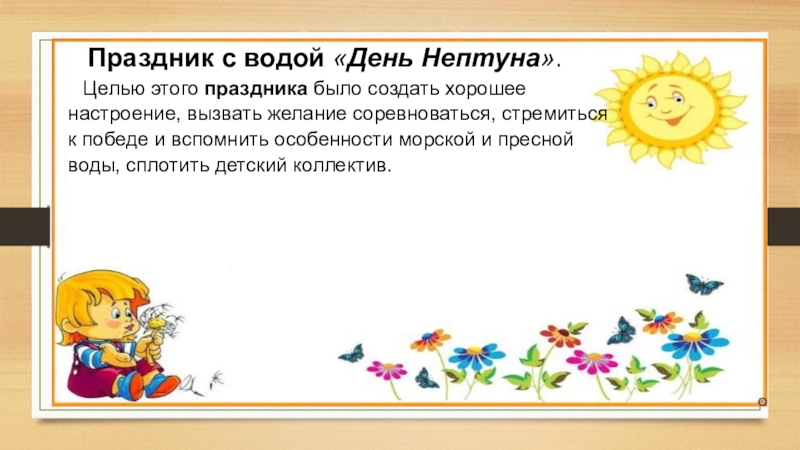 Праздник с водой «День Нептуна».Целью этого праздника было создать хорошее настроение, вызвать желание соревноваться, стремиться к победе и вспомнить особенности