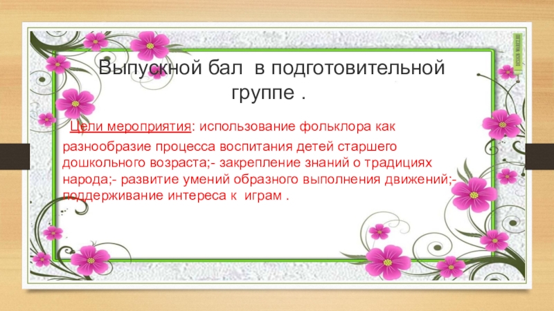 Выпускной бал в подготовительной группе . Цели мероприятия: использование фольклора как разнообразие процесса воспитания детей старшего