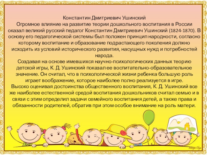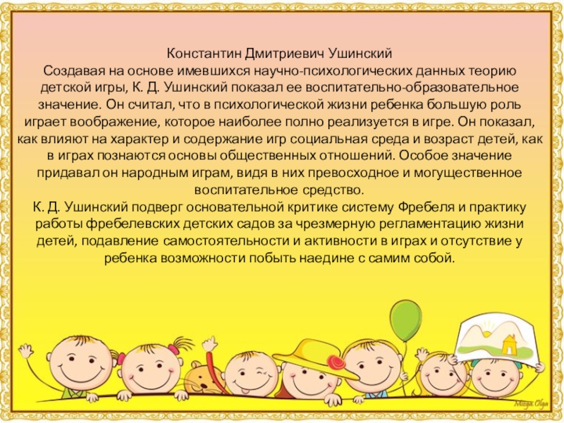 Создавая на основе имевшихся научно-психологических данных теорию детской игры, К. Д. Ушинский показал ее воспитательно-образовательное значение. Он считал, что в психологической жизни ребенка большую роль играет воображение, которое наиболее полно реализуется в игре.