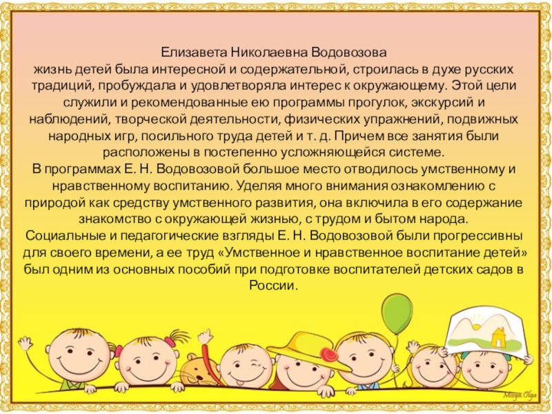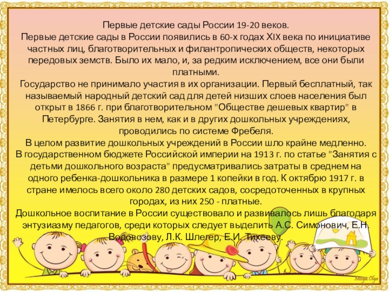 Дошкольное воспитание в России существовало и развивалось лишь благодаря энтузиазму педагогов, среди которых следует выделить А.С. Симонович, Е.Н. Водовозову, Л.К. Шлегер, Е.И. Тихееву.