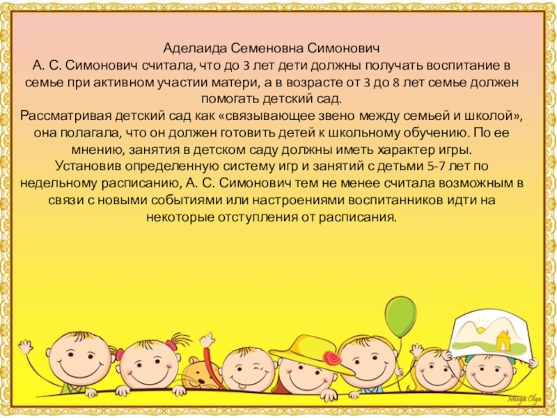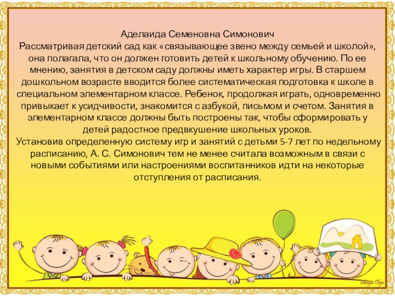 Установив определенную систему игр и занятий с детьми 5-7 лет по недельному расписанию, А. С. Симонович тем не менее считала возможным в связи с новыми событиями или настроениями воспитанников идти на некоторые отступления от расписания.