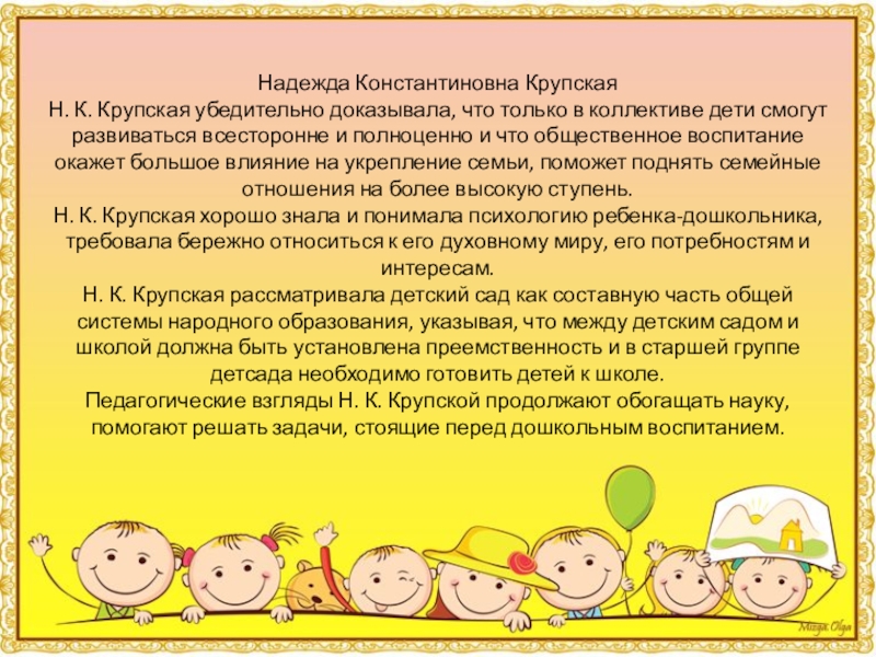 Педагогические взгляды Н. К. Крупской продолжают обогащать науку, помогают решать задачи, стоящие перед дошкольным воспитанием.